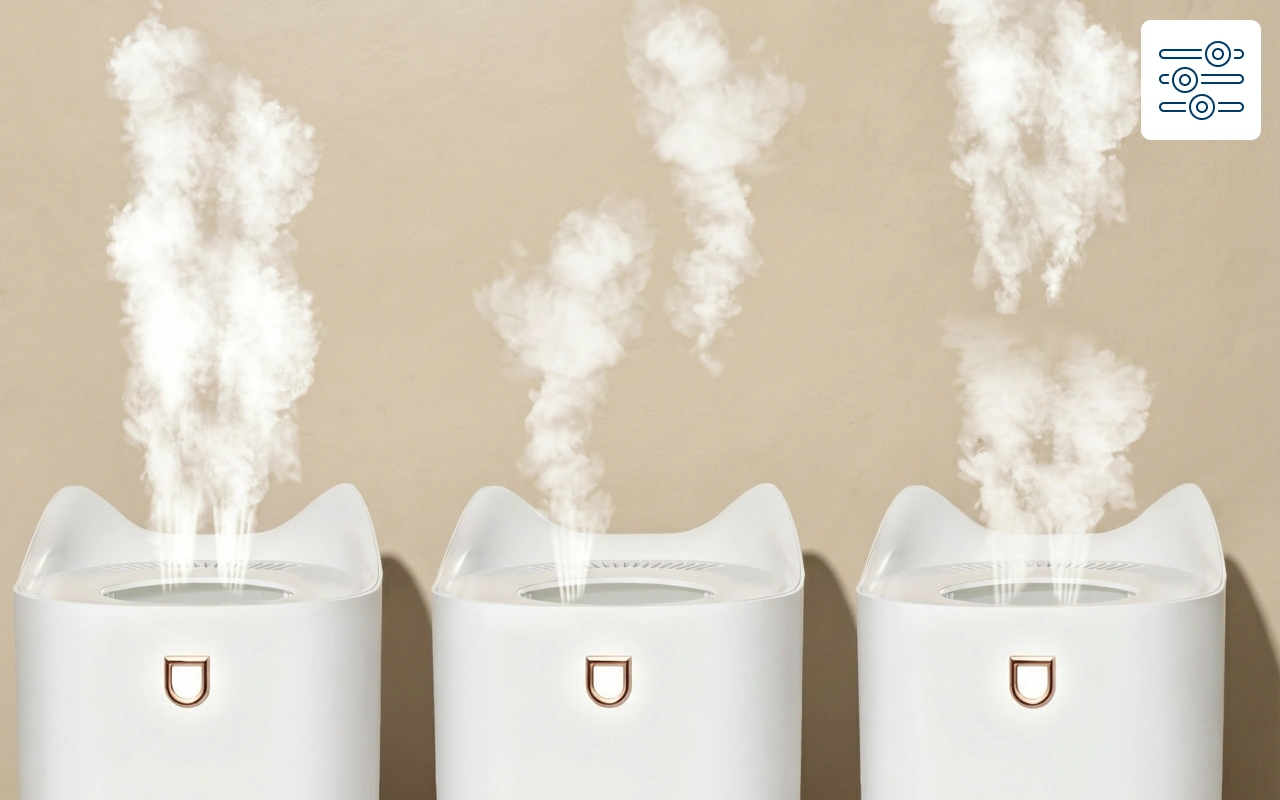 Intenzitu můžete ovládat výběrem mezi režimy kontinuální, přerušované nebo střídavé mlhy. Tato flexibilita zajišťuje vždy optimální úroveň vlhkosti.