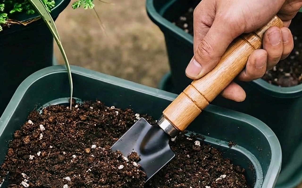Přesouvejte kompost úhledně kolem stonků bez nepořádku. Úzké lopatky pomáhají chránit citlivé kořeny.