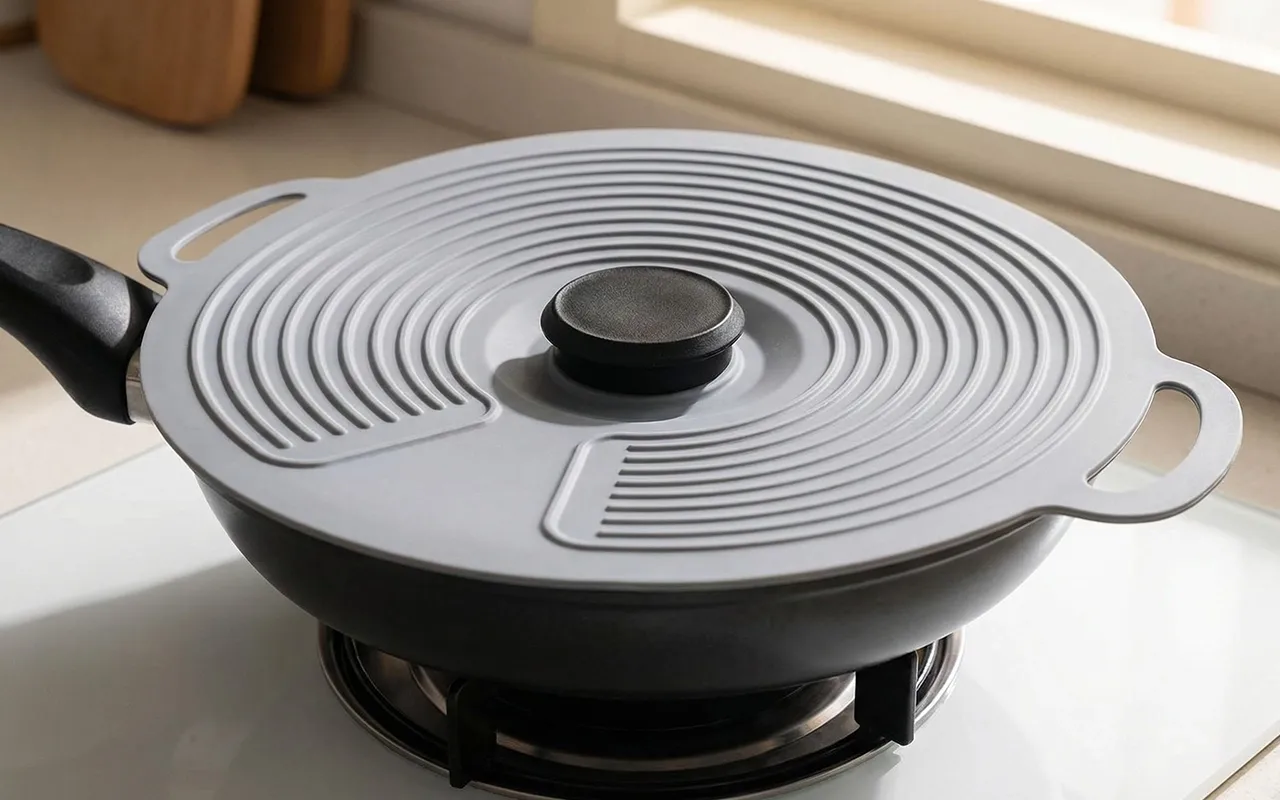 Tři pružné kruhy pasují na mnoho hrnců, plechů, hrnků a forem. Praktická boční ouška umožňují rychlé nadzvednutí, zatímco středové madlo chrání prsty.