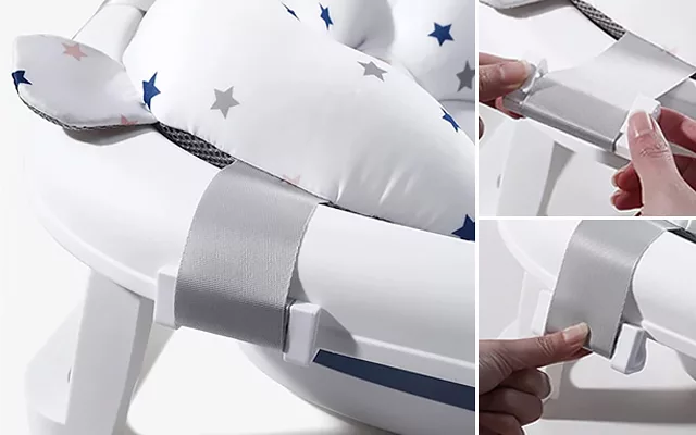 Naše sedátko je navrženo tak, aby udrželo vaše dítě během koupání v pohodlí. Podporuje jeho záda a pomáhá mu sedět vzpřímeně, čímž zabraňuje namáhání těla.