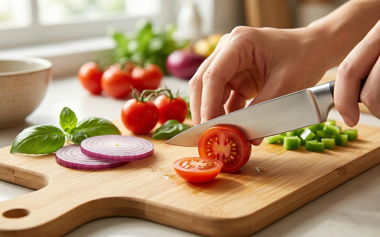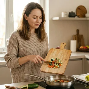 Vaření je jednodušší, protože suroviny zůstávají na prkénku Nygex přehledně uspořádané. Praktické držadlo pomáhá snadno a úhledně přenést nakrájené potraviny přímo do pánví.