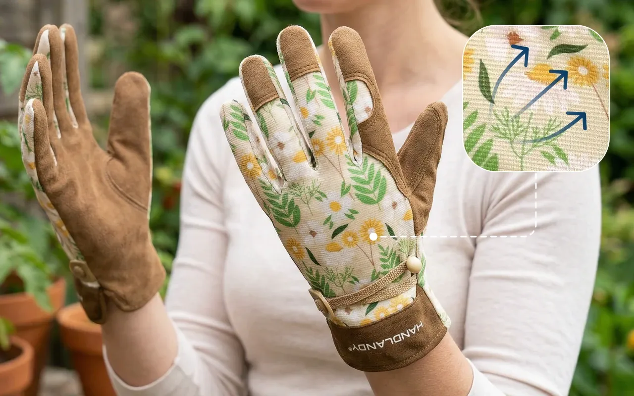 Pružná tkanina umožňuje volný pohyb prstů při uvazování jemných stonků. Vzdušný materiál omezuje pocení, takže dlaně zůstávají svěží i při práci.