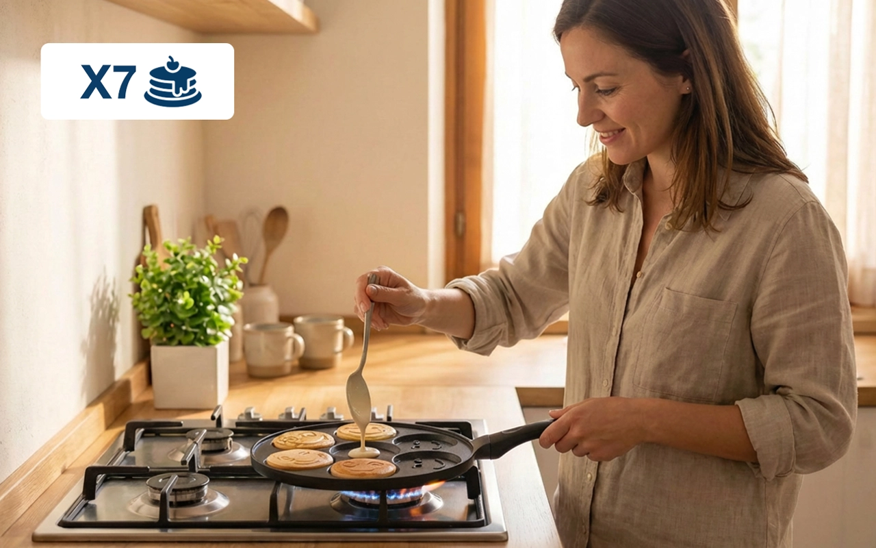 Sedm formiček vám pomůže naservírovat všem bez čekání navíc. Pánev na palačinky Nygex se zahřívá rovnoměrně, takže každý den dosáhnete spolehlivých výsledků.
