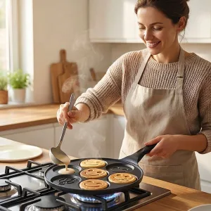 Proměňte uspěchaná rána v veselé chvíle, které si všichni společně užijete. Pánev na palačinky Nygex rychle připraví sedm roztomilých porcí. Nepřilnavý povrch usnadňuje uvolnění jídla a snižuje potřebu náročného drhnutí. Skvělá na vejce nebo těsto na plynových sporácích.