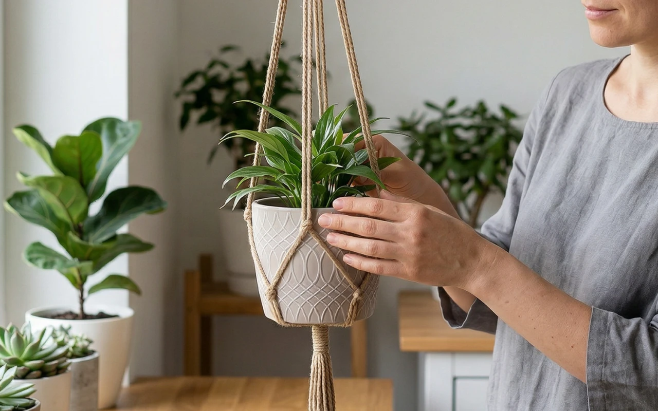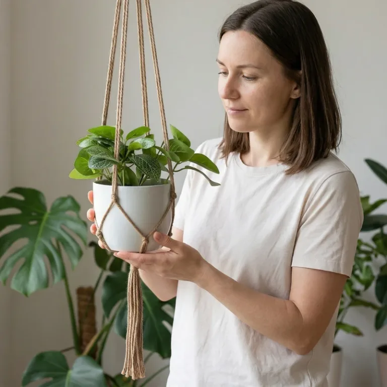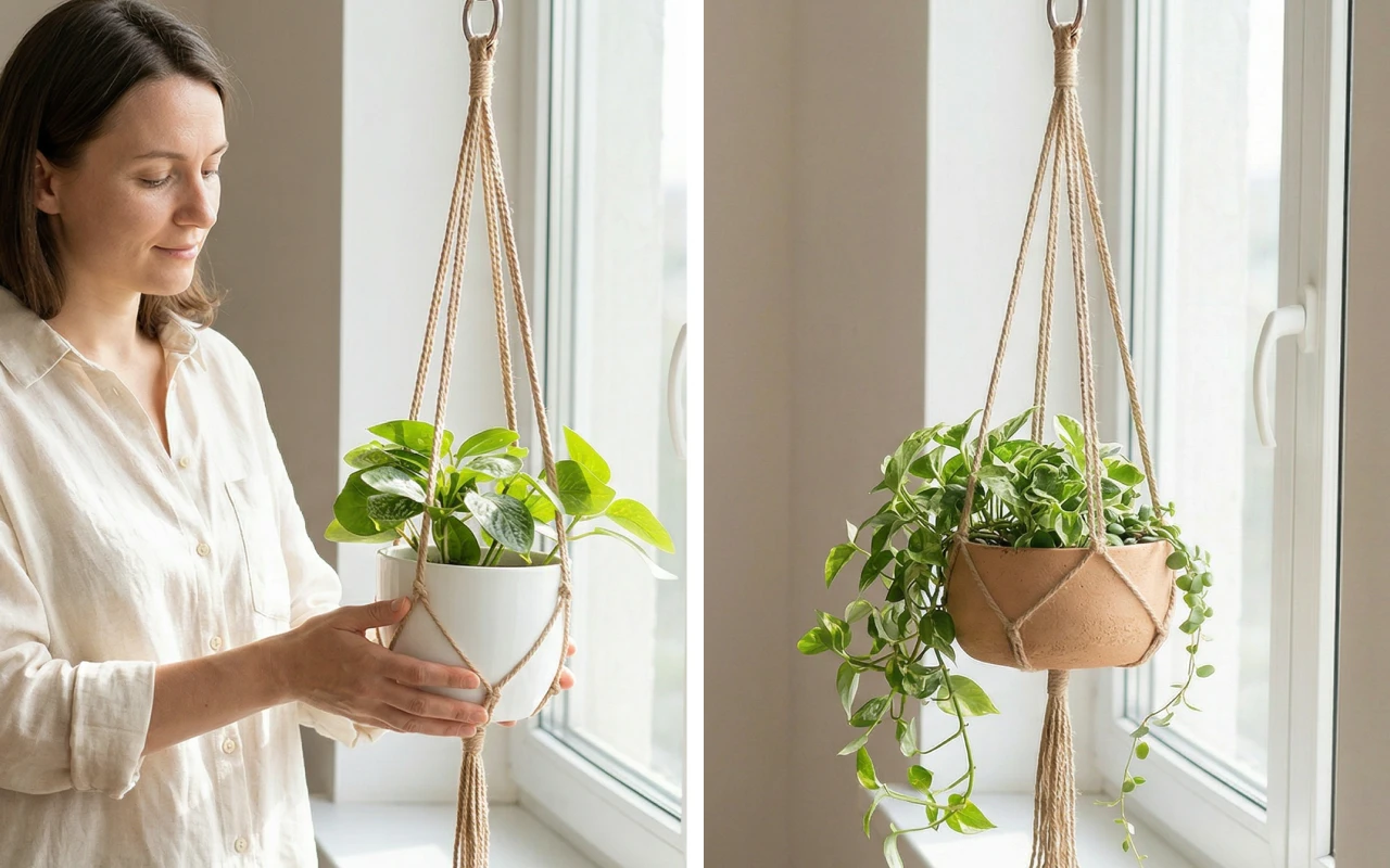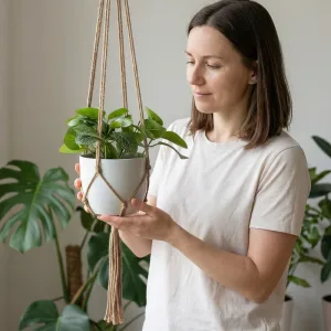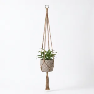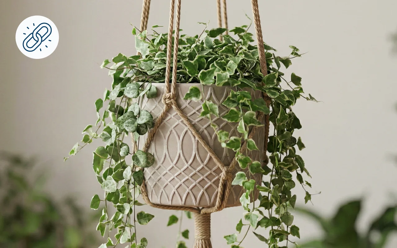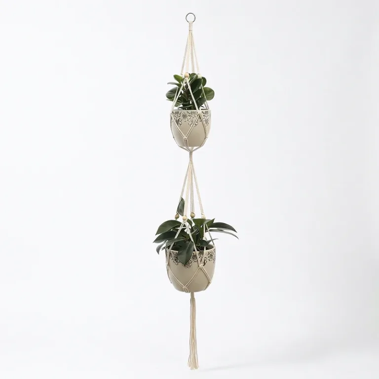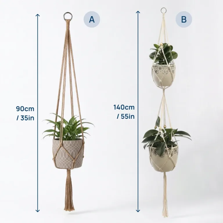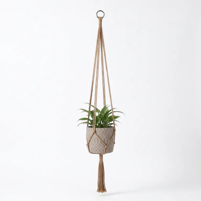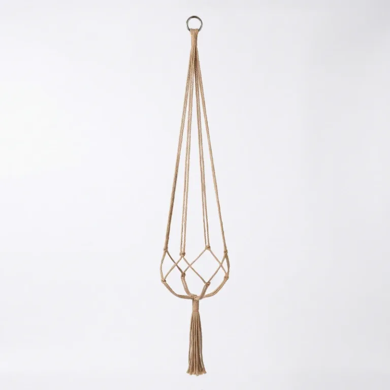 Silně pletené prameny bezpečně udrží těžké květináče vysoko nad domácími mazlíčky. Odolná přírodní vlákna se nevyvěšují, takže aranžmá zůstává vyvážené mnohem déle.