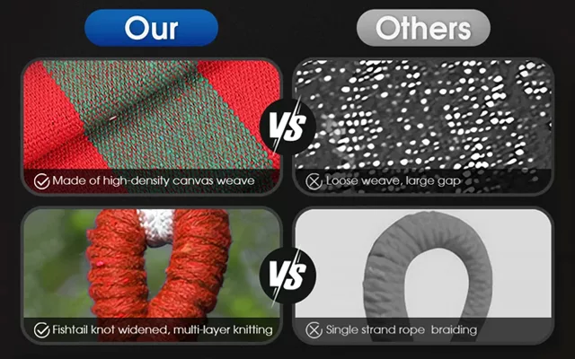 Vyrobena z vysoce kvalitní látky, naše houpací síť unese značnou váhu. To zajišťuje vaši bezpečnost a dlouhou životnost.
