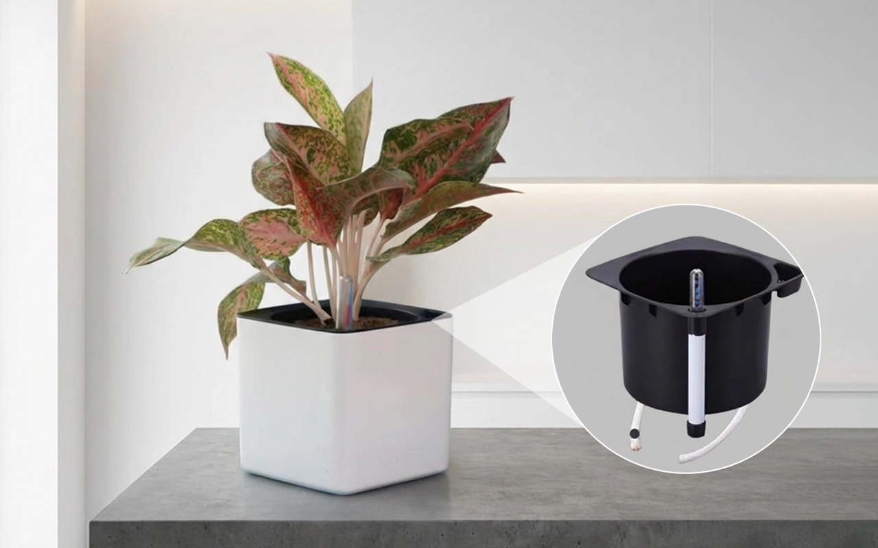 Průhledné okénko ukazuje stav vlhkosti na první pohled. Méně omylů znamená klidnější rutinu a spokojenější zeleň.