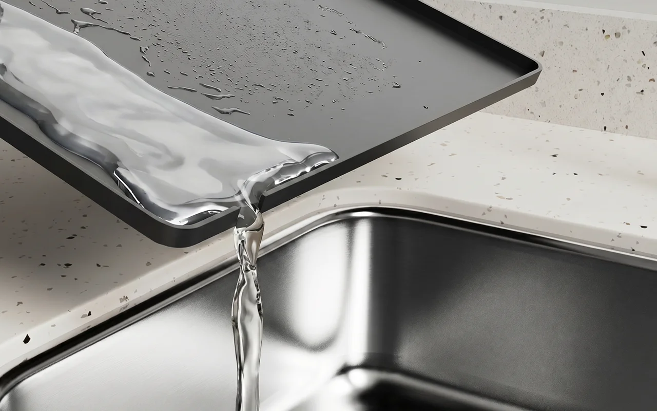 Kávová podložka Nygex zachycuje cákance, takže pracovní desky zůstávají déle zářivě čisté. Jednoduše ji zvedněte a nasbíranou tekutinu čistě vylijte chytrým rohovým výlevným otvorem.