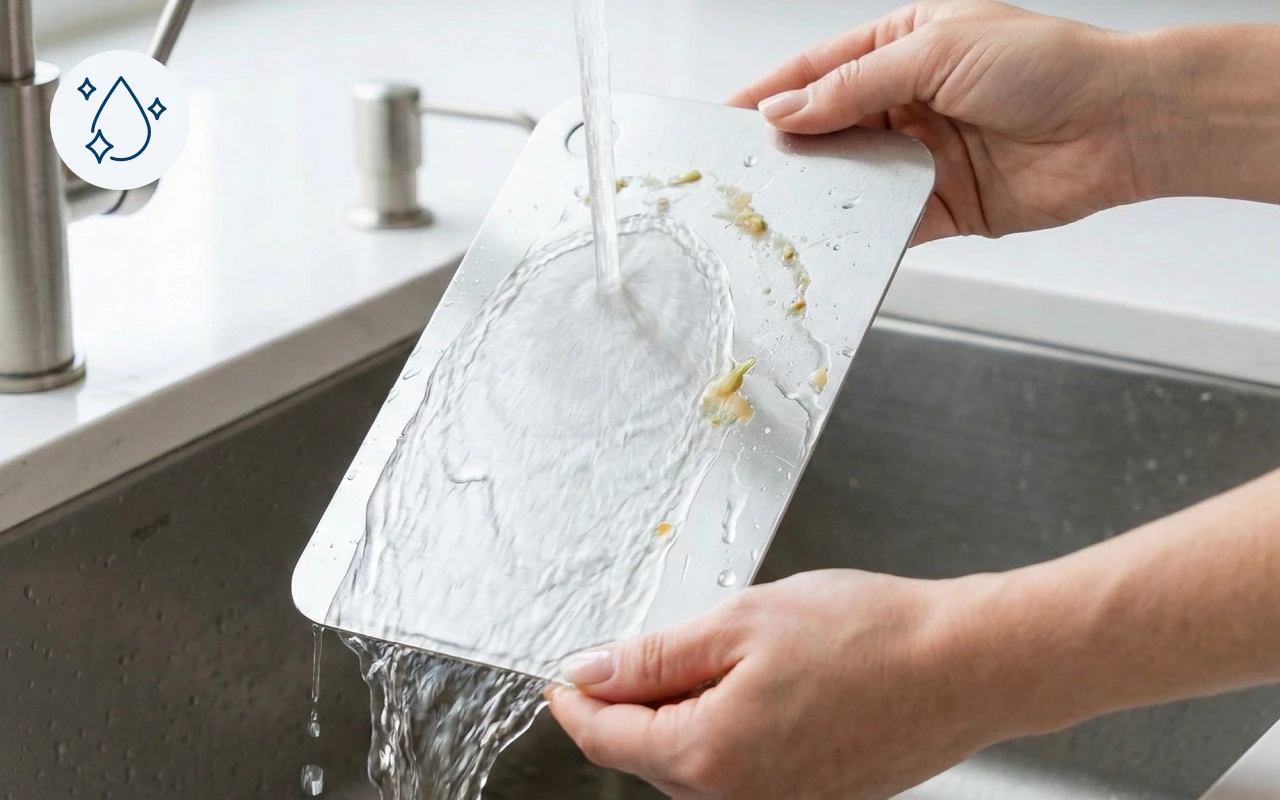 Nenasákavý kov rychle spláchne šťávu jen pod tekoucí vodou. Suchý povrch zabraňuje přetrvávajícím pachům a udržuje skříňky příjemně svěží.