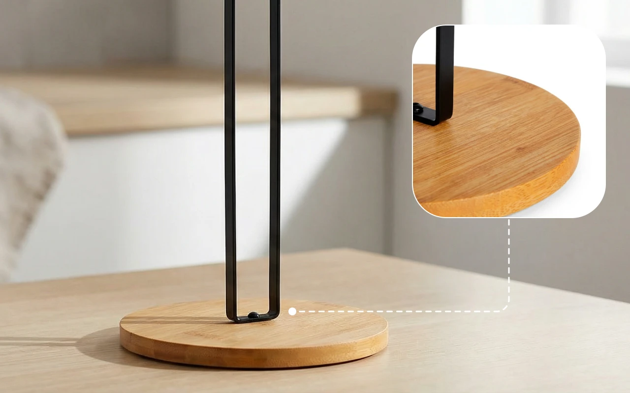 Stojan na papírové utěrky Nygex udržuje role vždy připravené na nečekané skvrny. Útržky uchopíte rychle během vaření, úklidu nebo rušných rán. Bambusová základna zůstává stabilní i na vlhkém povrchu. Štíhlá konstrukce šetří místo a hodí se do moderních interiérů.